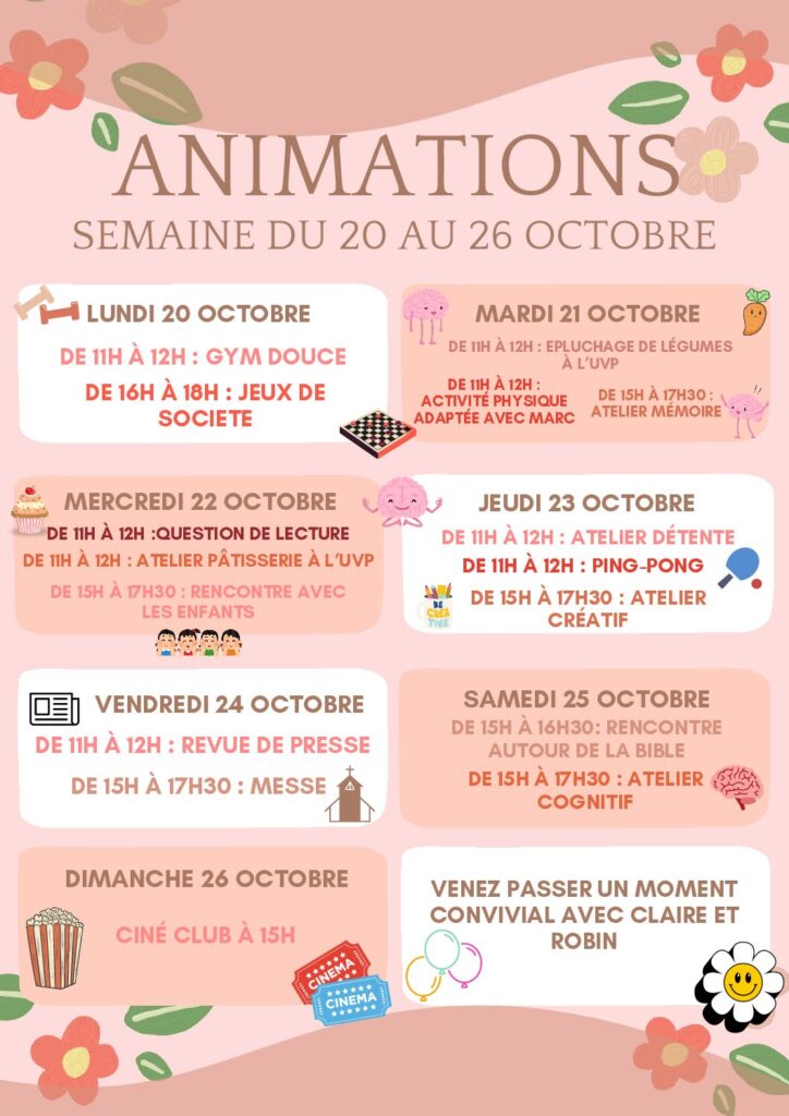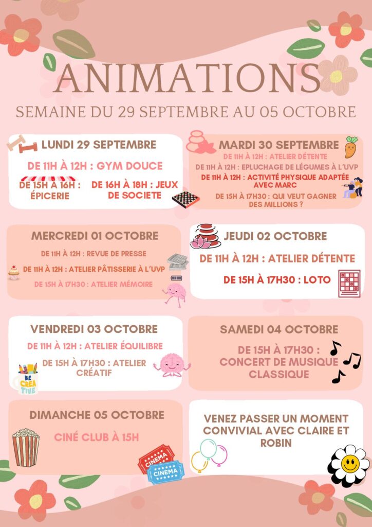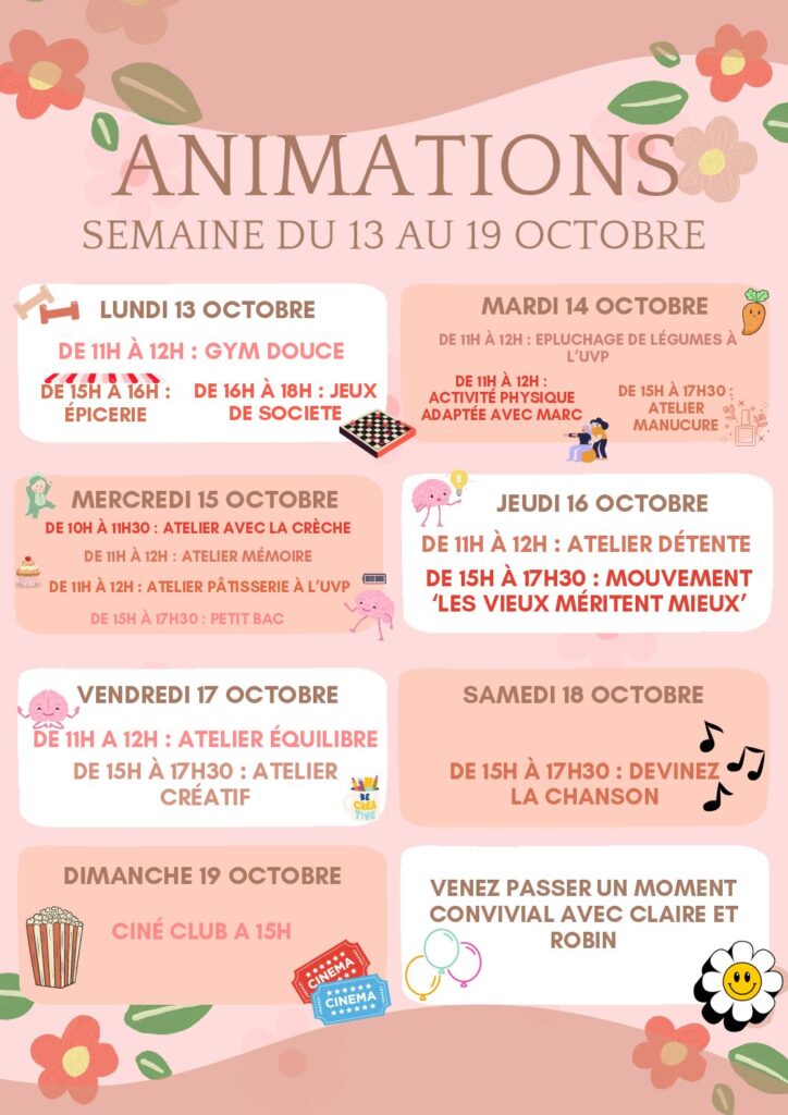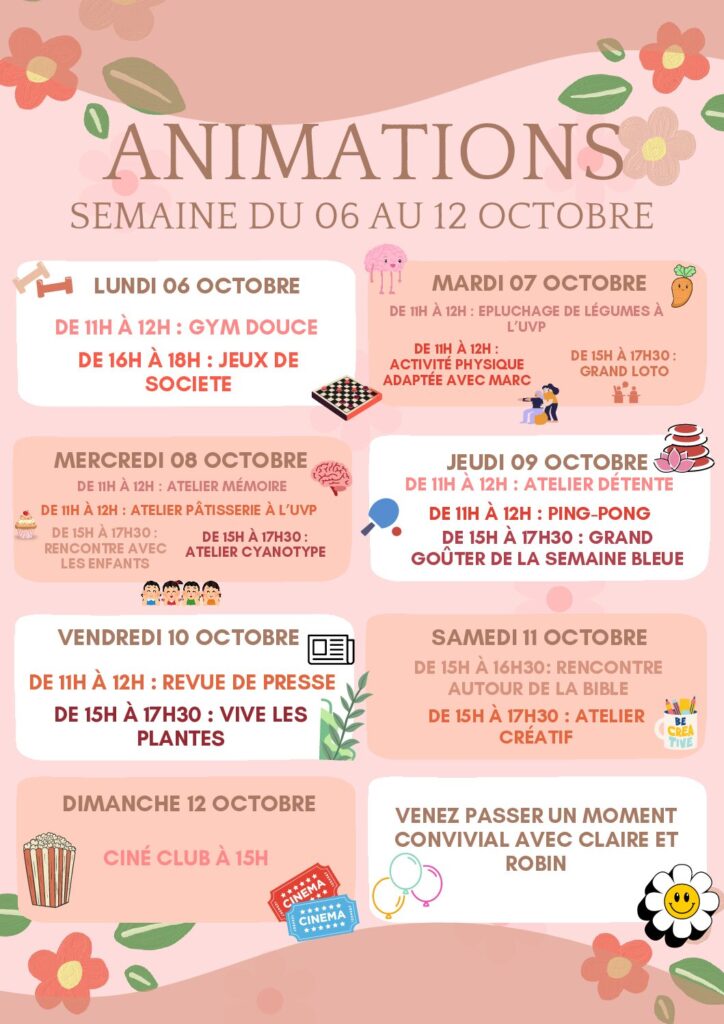 Atelier créatif, gym douce, relaxation, cinéma, ping-pong, jeux de société, rencontres intergénérationnelles, célébration d’anniversaires…