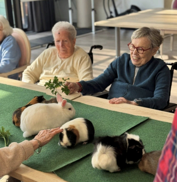 Parmi les animations marquantes du mois, la visite de la ferme de Lulu a apporté beaucoup de sourires aux résidents. La présence des petits animaux a créé une atmosphère particulièrement douce, propice aux échanges, à la curiosité et à l’apaisement.